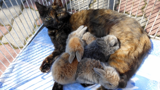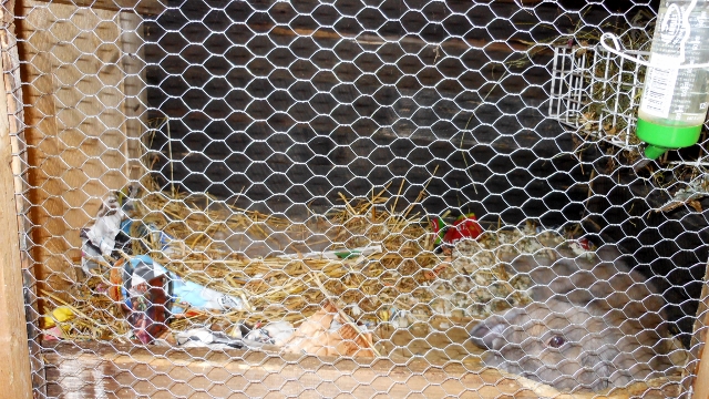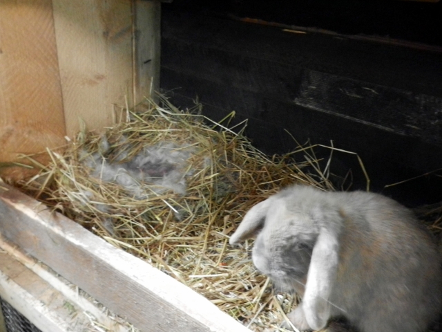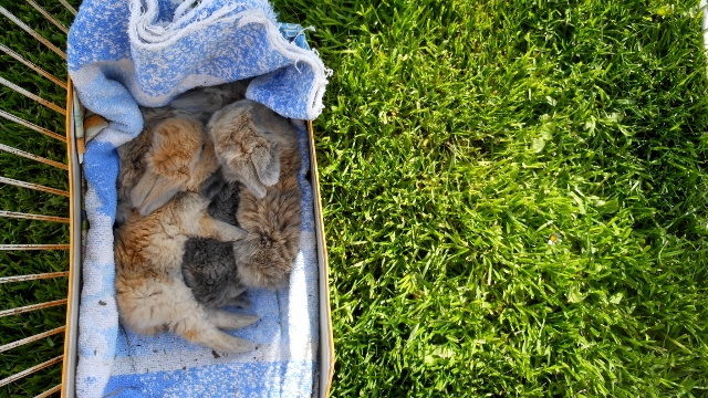 Malích králičkov niekedy vyberieme z klietky vyhriať sa na slniečko, kde ich stráži mama zajačica.